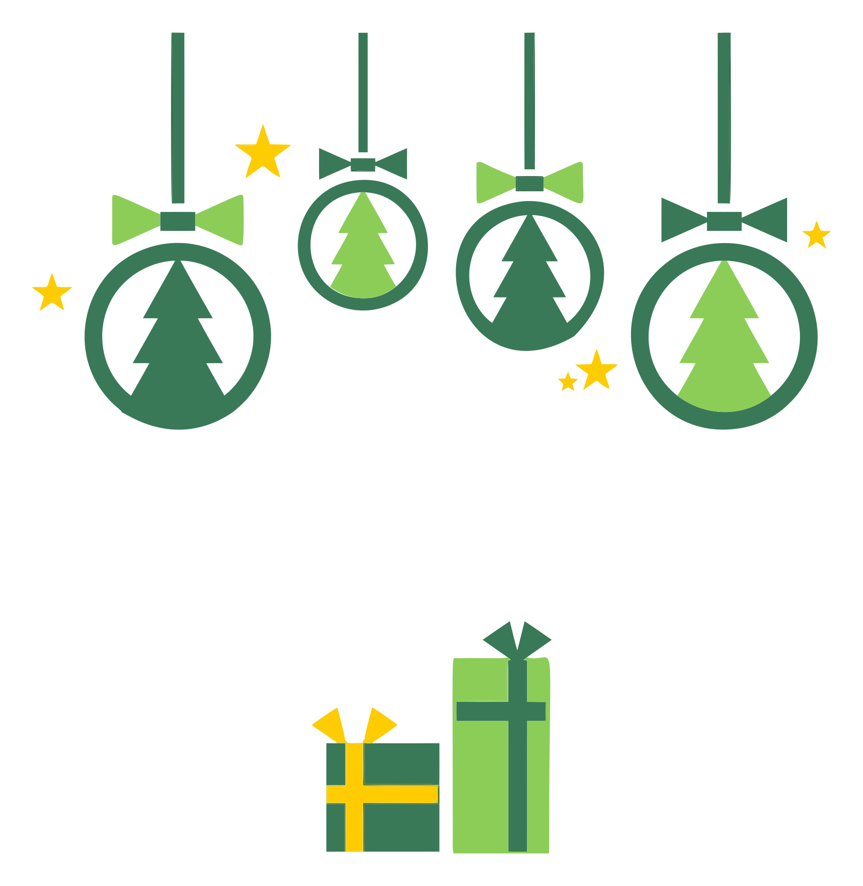 This features a festive scene with four green Christmas ornaments hanging from the ceiling. Each of these ornaments has a bow on top, adding to their holiday charm. In addition to the ornaments, there are two presents placed on the floor, one near the left side and another towards the right side of the image. The overall scene creates an inviting atmosphere for the upcoming Christmas celebration.