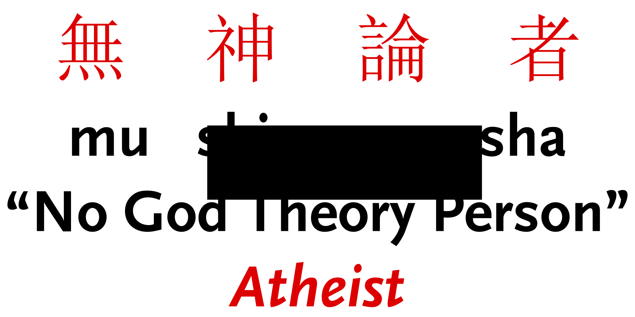 This is a poster with Asian writing on it, possibly Japanese. It appears to be an advertisement or promotional material for something related to religion or spirituality. The text reads "Mu Sha Sha" and "No God Theory Person" in red letters. There are also other words written in the background that may provide additional context or information about the poster's message.
