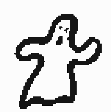 This features a black and white drawing of a ghost. The ghost is depicted with its arms outstretched, giving the impression that it's reaching for something or someone. The drawing appears to be a simple outline of the ghost, with no additional details or shading. The overall effect is a minimalist representation of this classic Halloween character.