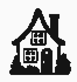 This features a black and white house with a chimney, which is the main focus of the scene. The house has a doorway that leads to the interior, giving it an inviting appearance. Above the doorway, there are two windows on each side, providing natural light and ventilation for the living space. The overall design of the house gives it a classic and charming look, making it an appealing subject for artwork or decoration.
