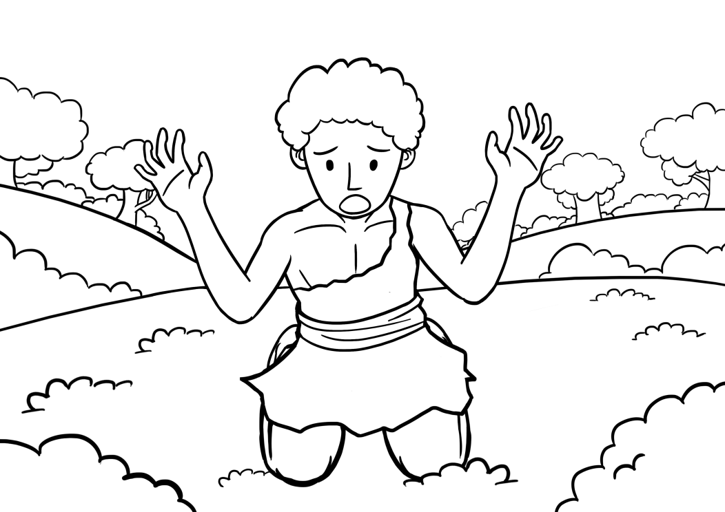 This features a cartoon drawing of a man with his arms raised, appearing to be in distress or making an exaggerated gesture. He is wearing a loincloth and has a sad expression on his face. The scene takes place outdoors, with trees visible in the background. The man's body language suggests that he might be reacting to something unexpected or challenging in his environment.