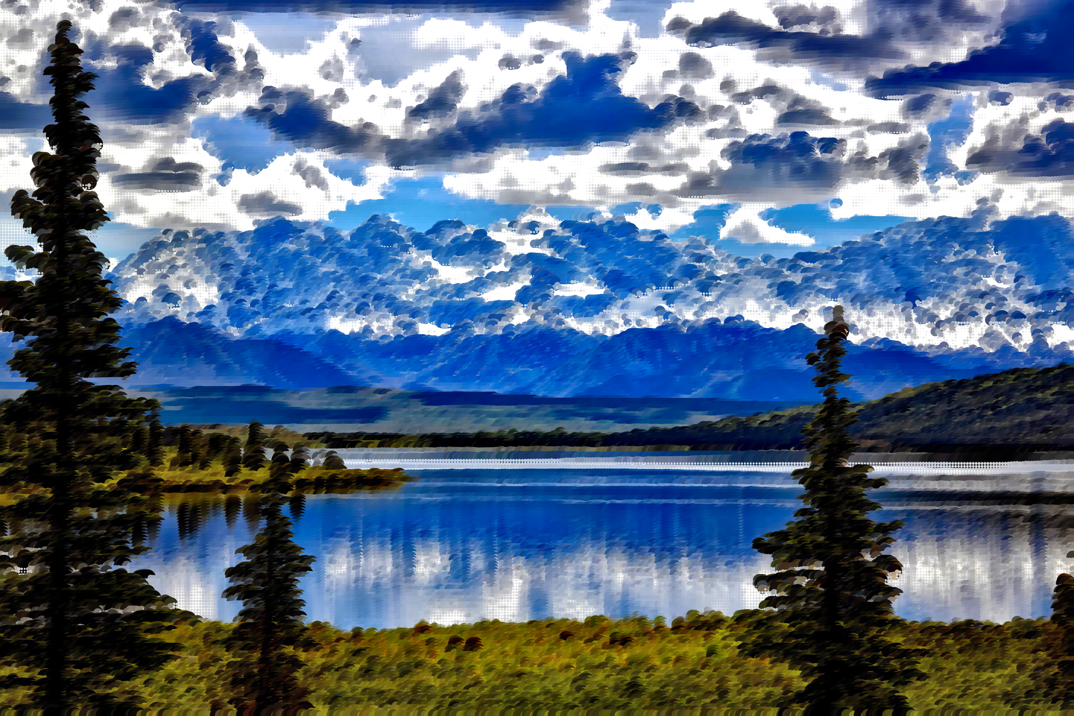 This features a serene mountain lake surrounded by trees and mountains. The sky above the lake is filled with clouds, creating a picturesque scene. The mountains in the background are covered with snow, adding to the beauty of the landscape. The reflection of the sky on the water creates a sense of tranquility and harmony with nature. This peaceful setting evokes feelings of relaxation and escape from the hustle and bustle of everyday life.