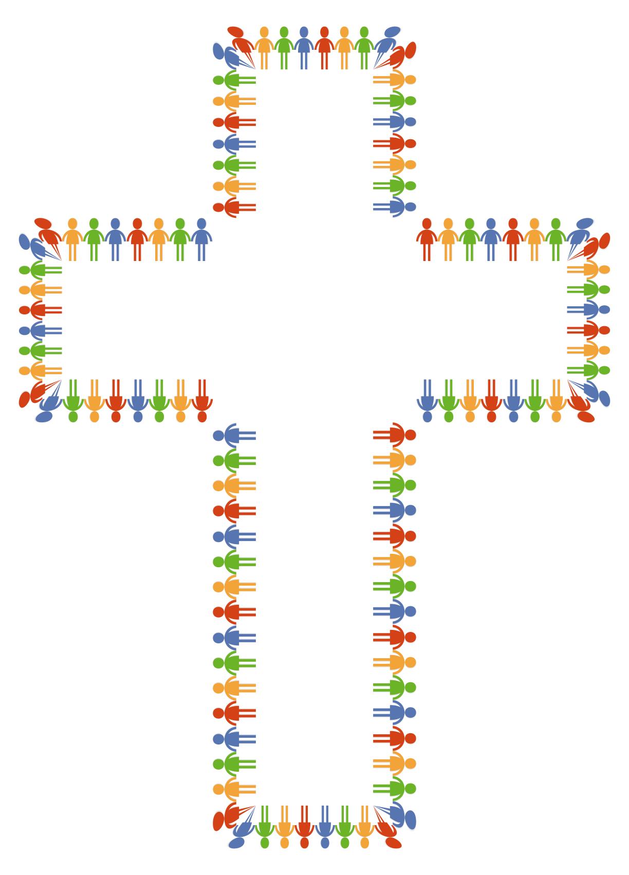 This features a large, colorful cross made up of many small figures. These figures are arranged in various positions around the cross, creating an intricate and visually appealing design. The cross is composed of people standing next to each other, forming a pattern that resembles a crowd or a group of individuals. The colors used for these figures include red, blue, green, yellow, orange, and white, adding vibrancy and depth to the overall composition. This artistic representation of the cross showcases creativity and attention to detail in its design.
