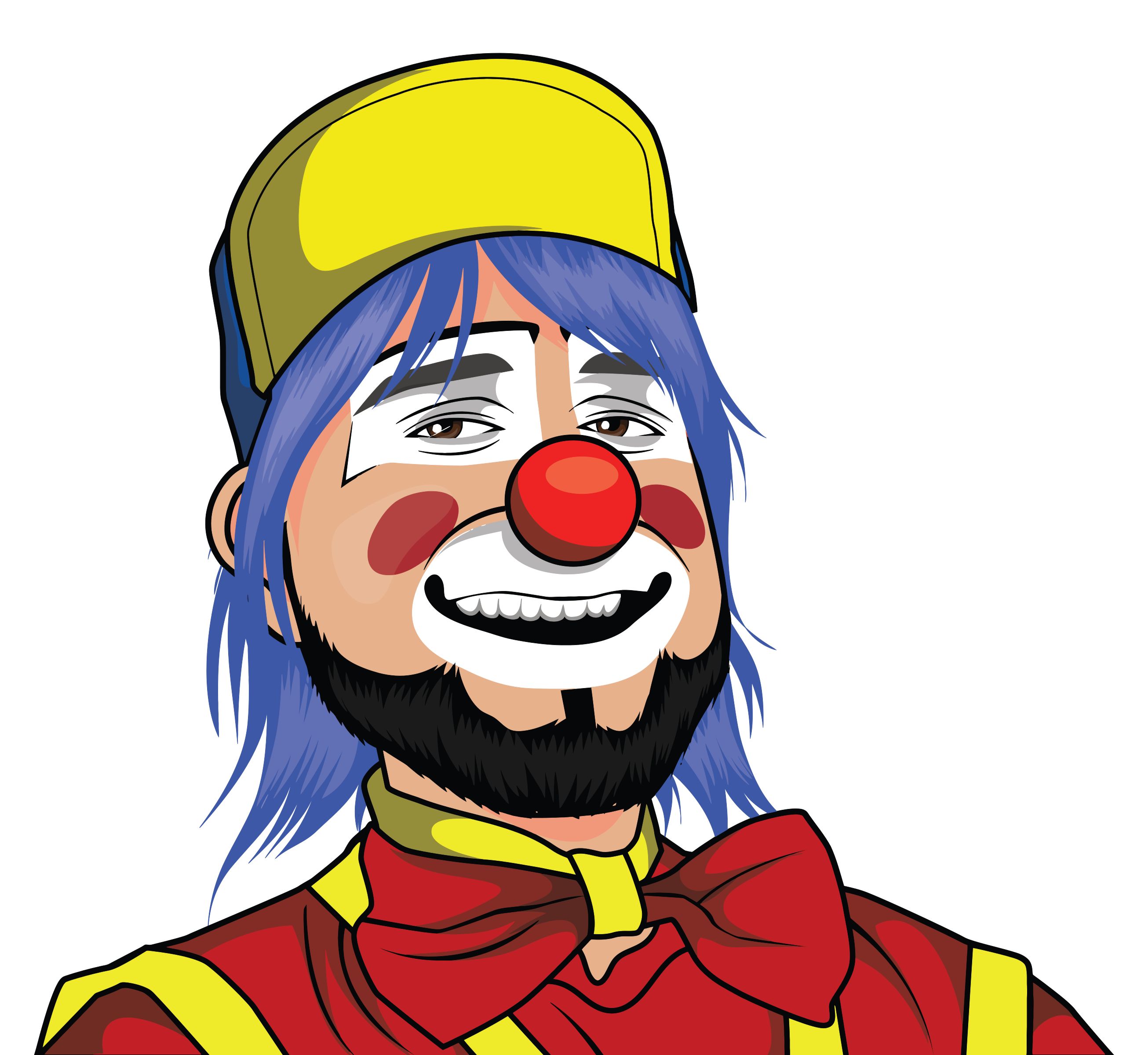 This features a clown with a yellow hat and red hair, wearing a red bow tie. He is smiling and has a big nose, which is a characteristic feature of clowns. His face is painted to resemble a sad clown, but his smile suggests that he's happy despite the appearance. The clown appears to be looking directly at the viewer, capturing their attention with his unique look.