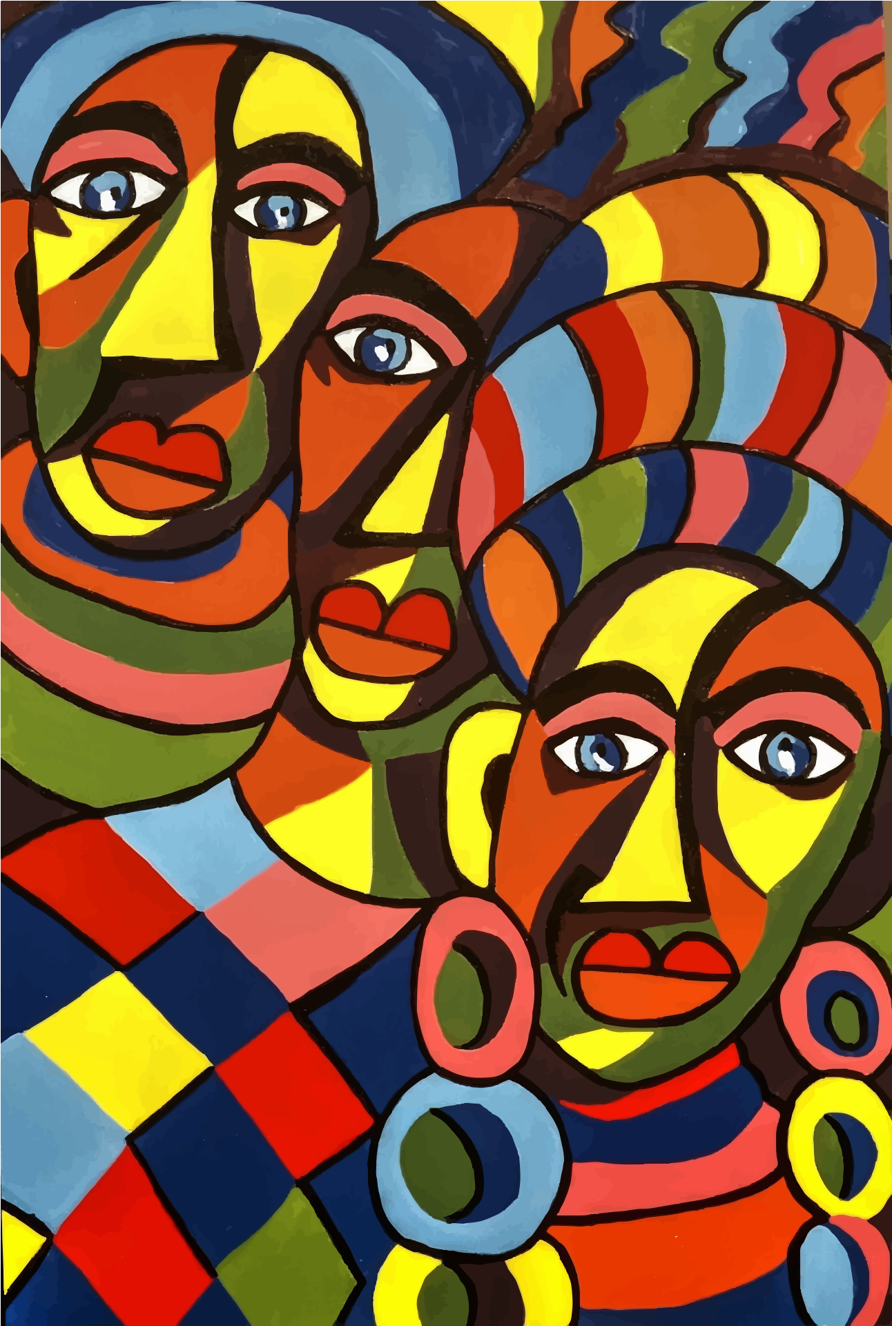 This features a vibrant and colorful painting of three faces, each with unique characteristics. One face is positioned on the left side of the painting, another in the middle, and the third one on the right side. Each face has distinctive features such as earrings, which are visible in various sizes and colors. The painting showcases a variety of colors and patterns that create an eye-catching visual experience.