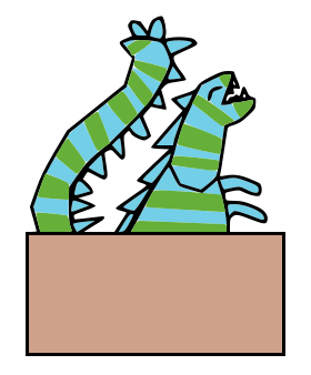 This features a creative and whimsical scene of two cartoon dinosaurs sitting inside a brown box. One dinosaur is positioned on the left side, while the other occupies the right side of the box. Both dinosaurs have green stripes and are depicted in blue colors, giving them an interesting appearance. The box itself has a rectangular shape, providing ample space for the dinosaurs to sit comfortably inside. This playful scene could be used as a decoration or a fun way to store items within the box.