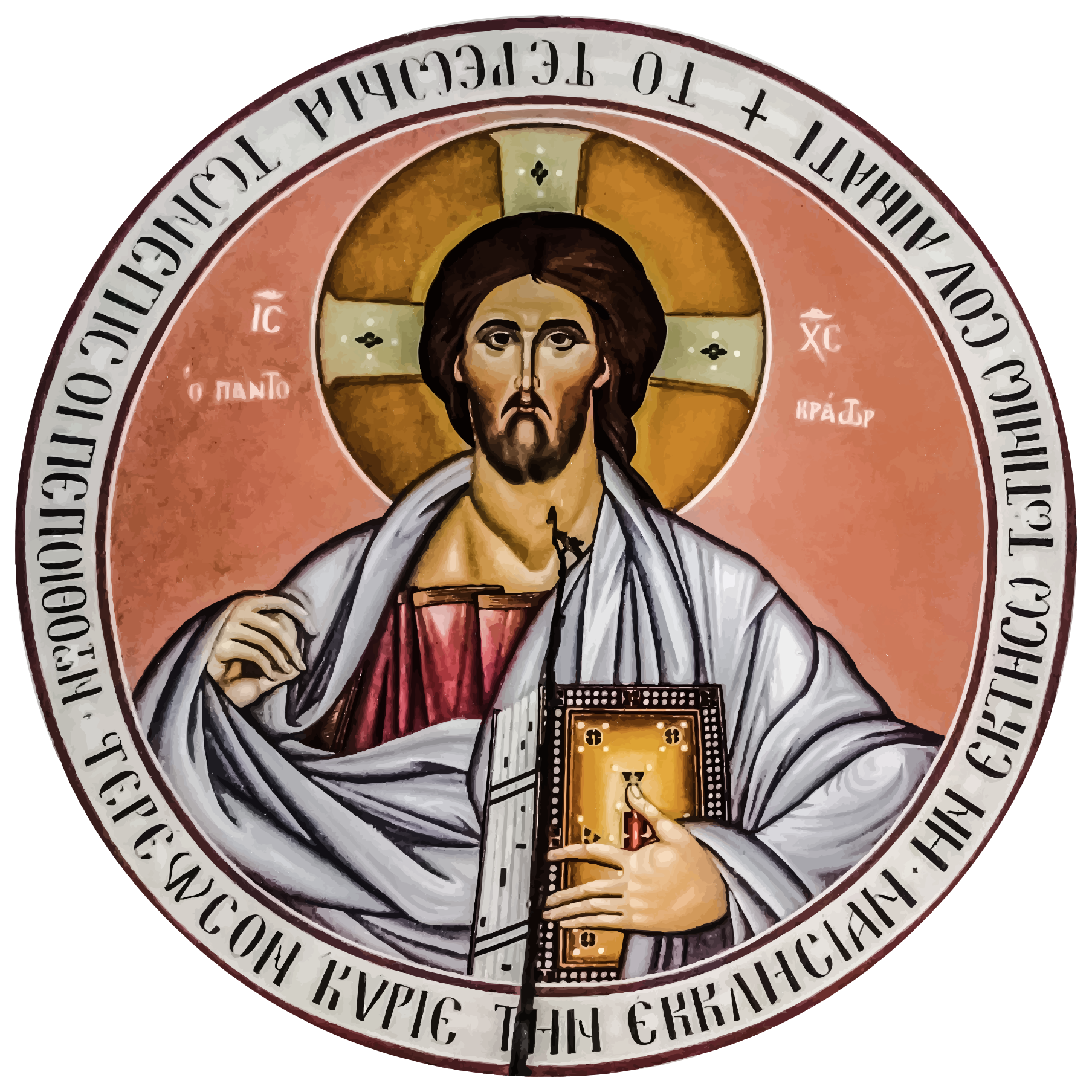 This features a round icon of Jesus, with the figure prominently displayed in the center. He is wearing robes and holding a book, which adds to his religious significance. The icon has a cross on top, further emphasizing its Christian theme. The artwork appears to be quite detailed, showcasing the intricate craftsmanship that went into creating this beautiful piece of religious art.