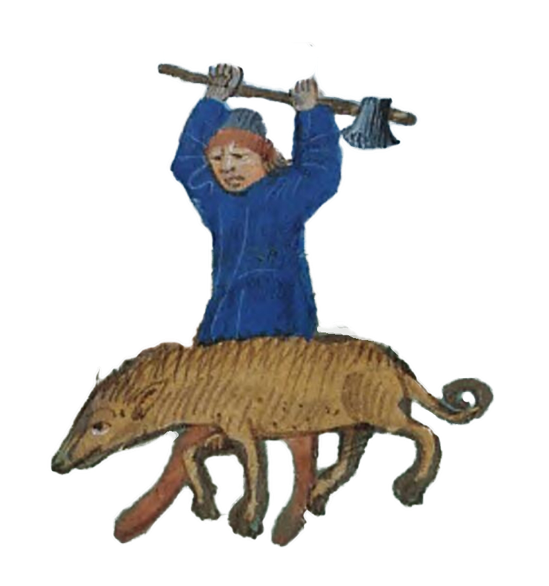 This features a woman dressed in blue, holding an axe and riding on top of a brown pig. She appears to be about to strike the animal with her weapon. This scene is depicted as a stylized drawing or painting, giving it a unique artistic quality. The woman's outfit and the pig's position suggest that this could be an illustration from a storybook or a medieval-themed piece of artwork.