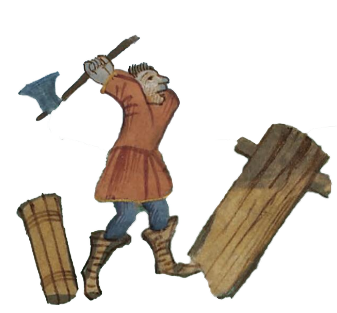 This features a man dressed in red clothing, holding an axe and swinging it with great force. He appears to be a lumberjack, focused on his task of cutting down trees. In the scene, there are several logs scattered around him, indicating that he is actively engaged in his work. The man's determination and skill are evident as he expertly handles the axe, showcasing his proficiency in this trade.