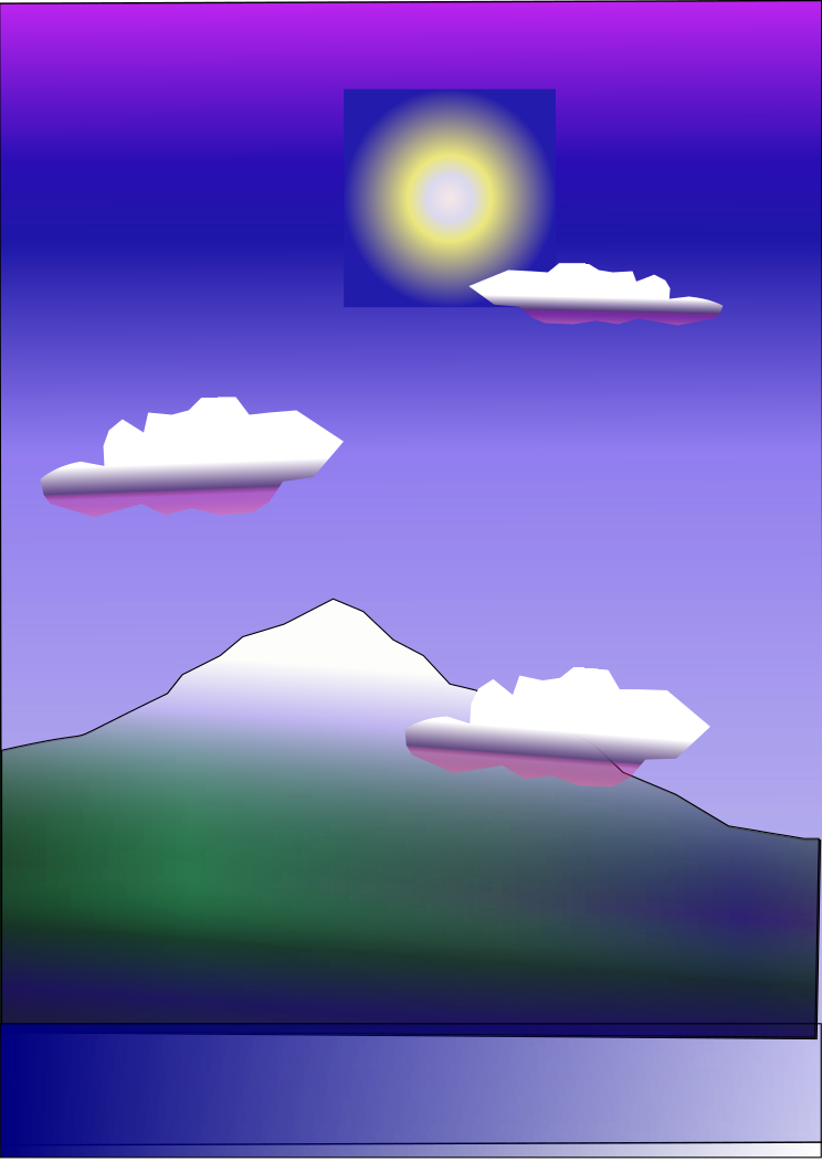 This features a beautiful scene of clouds floating in the sky above a mountain. There are three distinct clouds visible, each with different shapes and sizes. One cloud is located near the top left corner of the image, another one is situated towards the center-left side, and the third cloud can be found on the right side of the image. The sun is also present in the scene, shining brightly above the mountain, creating a serene atmosphere.