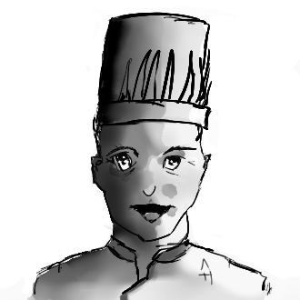 This features a man wearing a chef's hat, standing in front of a black background. He appears to be looking at the camera with an intense expression on his face. His attire suggests that he is a professional chef or cook, possibly working in a restaurant setting. The man's facial features are drawn in a cartoon-like style, giving him a unique and interesting appearance.