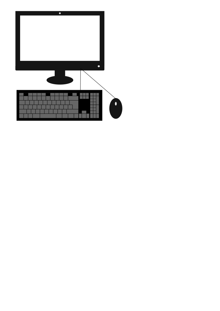 This is a black and white drawing of a computer setup. It features a keyboard, mouse, and monitor all placed on top of each other. The keyboard is positioned to the left side of the monitor, while the mouse is located above it. The monitor takes up most of the space in the image, extending from the center towards the right edge. This drawing gives an impression of a minimalist setup with only essential components visible.