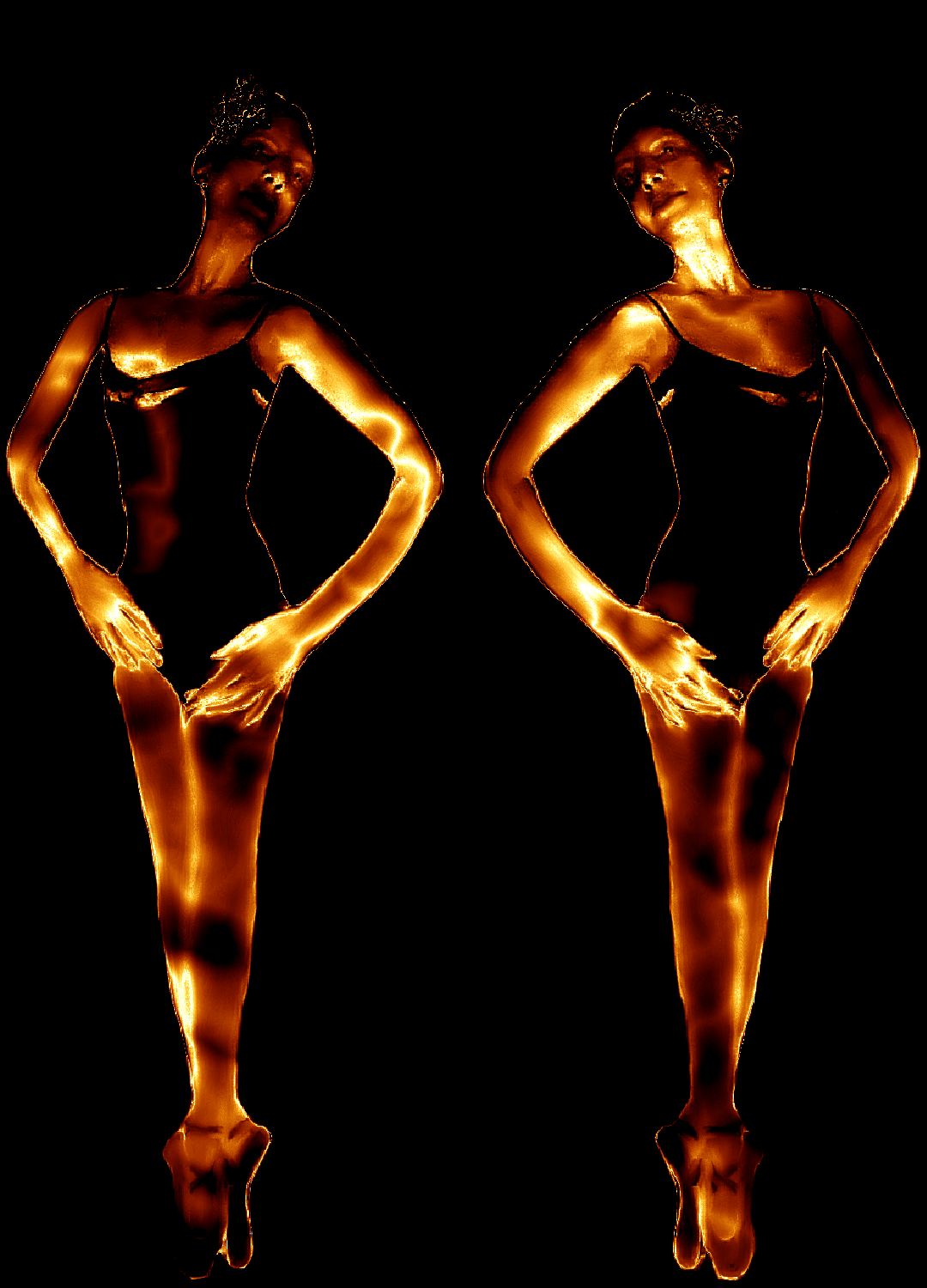 This features two women standing side by side, both dressed in black and gold attire. They are posing for the camera with their hands on their hips, showcasing their ballet positions. Their outfits give them a golden appearance, as if they are illuminated by light. The scene appears to be a professional photo shoot or performance, capturing the elegance and grace of these two dancers.