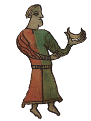 This features a man dressed in red, green, and yellow clothing. He is holding a bowl or plate in his hands while standing on one foot. The man appears to be wearing a crown, adding an element of royalty to the scene. The overall atmosphere suggests that this could be a painting or drawing, with the man being the main focus of the image.