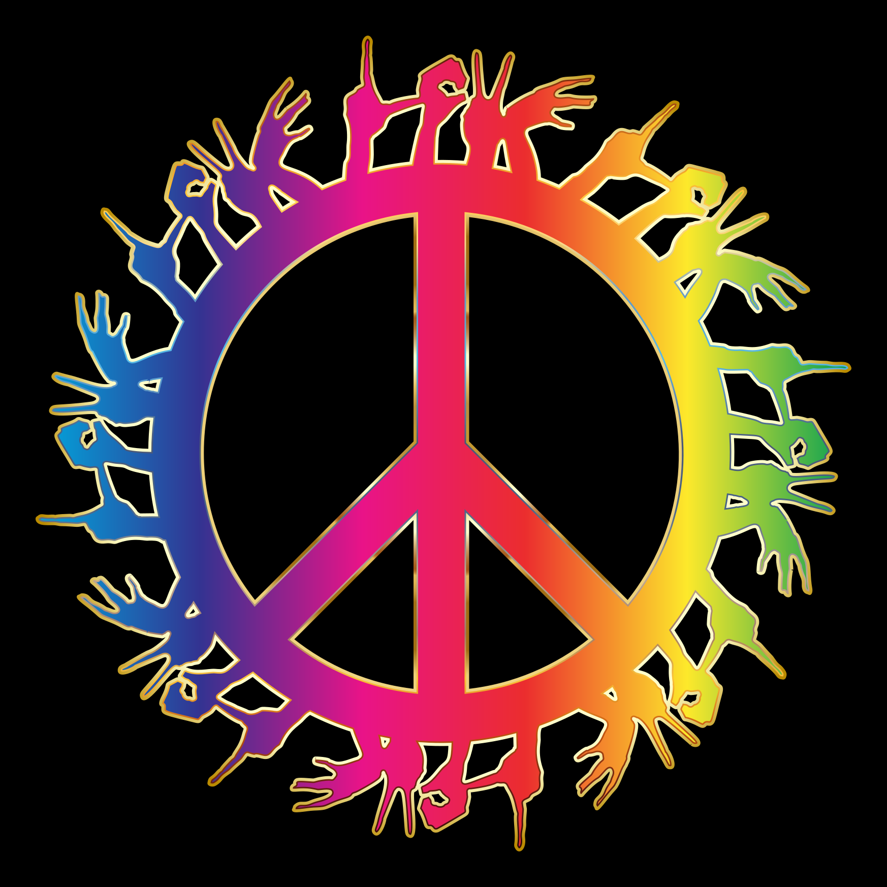 This features a large, colorful peace sign with many hands outlined in various colors. These hands are arranged around the outer edge of the circle, creating an eye-catching and vibrant display. The peace sign itself is also colored in rainbow hues, adding to its visual appeal. This unique design makes for an interesting and creative representation of a symbol often associated with harmony and unity.
