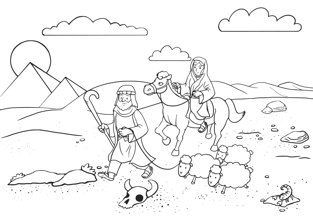 This depicts a scene of a shepherd leading three sheep through the desert. The shepherd is walking in front of the sheep, while another person rides on horseback behind him. In addition to the people and animals, there are two pyramids visible in the background, adding an interesting architectural element to the scene. The sun appears to be either setting or rising over the pyramids, casting a warm glow on the landscape. There is also an animal skull lying on the ground, possibly indicating that the shepherd and his companions have encountered some wildlife during their journey through the desert.