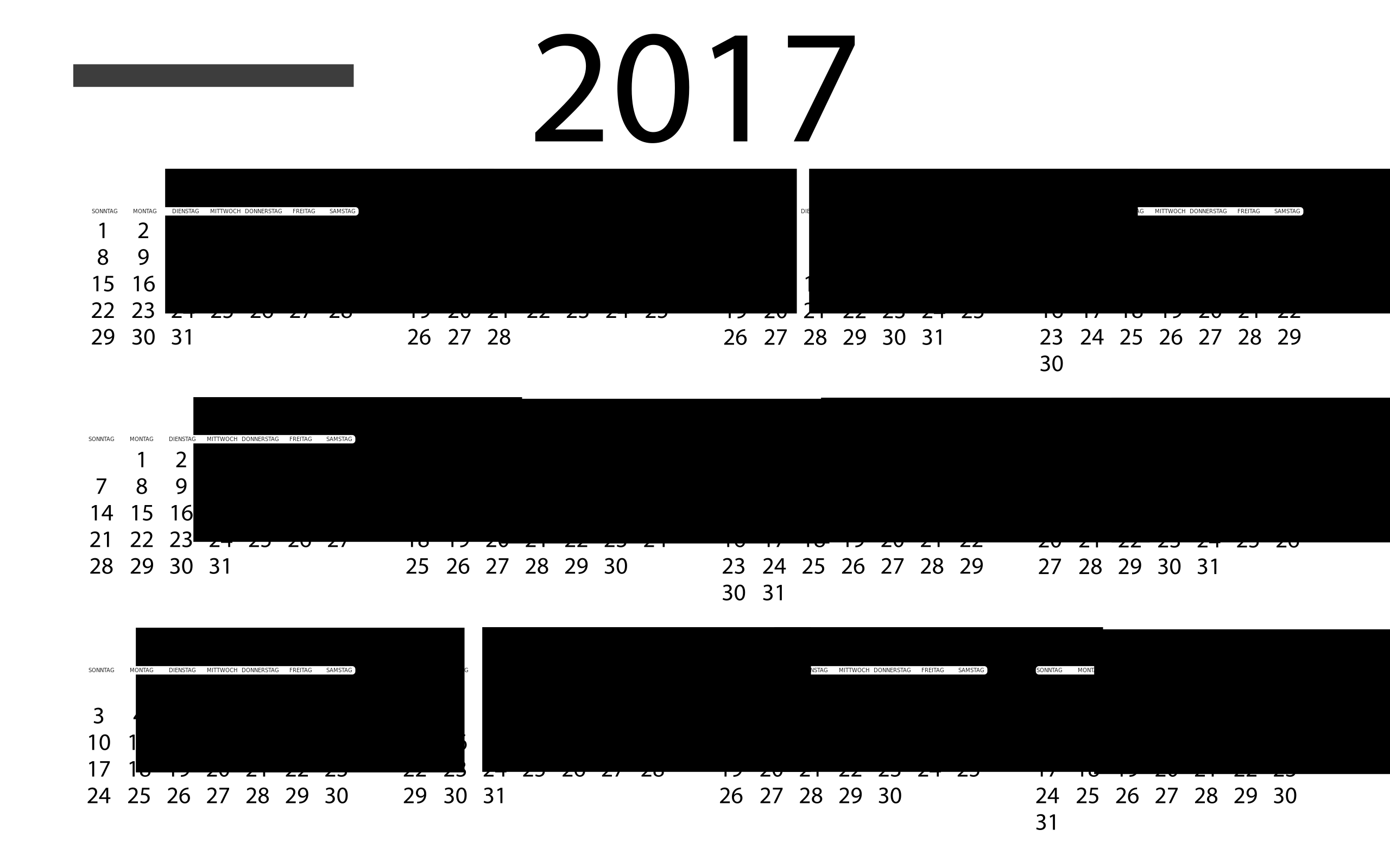 This is a black and white calendar with the year 2017 displayed at the top. The calendar has been partially covered in black marker, making it difficult to see the majority of the dates. Despite this, the numbers are still visible, indicating that the calendar is still functional despite its obscured appearance.