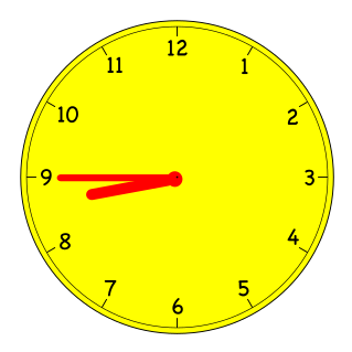 This features a yellow analog clock with black numbers, displaying the time of 8:45. The clock is round in shape and has a red arrow pointing to the number nine on its face. This unique design element adds an interesting visual touch to the otherwise simple clock. The clock's bright color and bold arrow make it stand out against any background, making it easy for anyone to quickly glance at the time without needing to read the numbers directly.