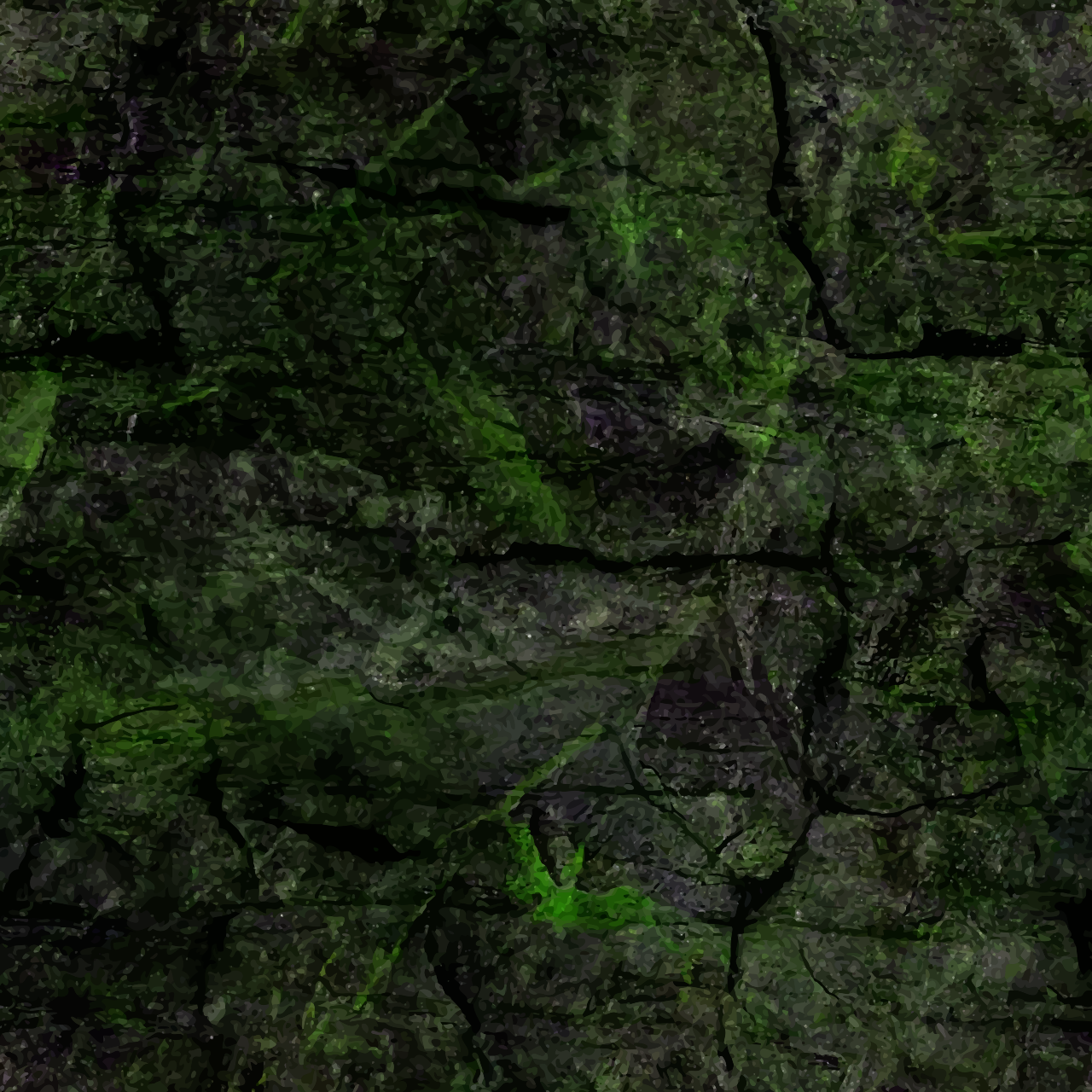 This features a close-up of a green stone wall with various textures and colors. The wall appears to be covered in algae, giving it a unique and interesting appearance. There are light green lines on the stones, adding depth and character to the surface. The cracks in the stone create an organic and natural look, further enhancing the overall visual appeal of the scene. This image captures the beauty found in nature's intricate patterns and textures.