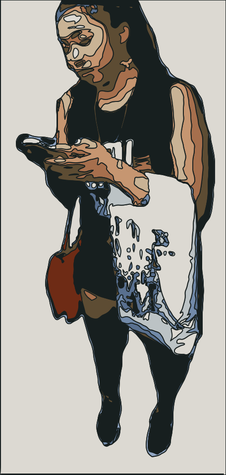 This features a woman standing in front of a white background, holding a cell phone and a shopping bag. She is wearing black clothing and appears to be looking at her phone while possibly checking the contents of the bag or browsing through her messages. The scene gives off an artistic vibe with its colorful and detailed appearance.