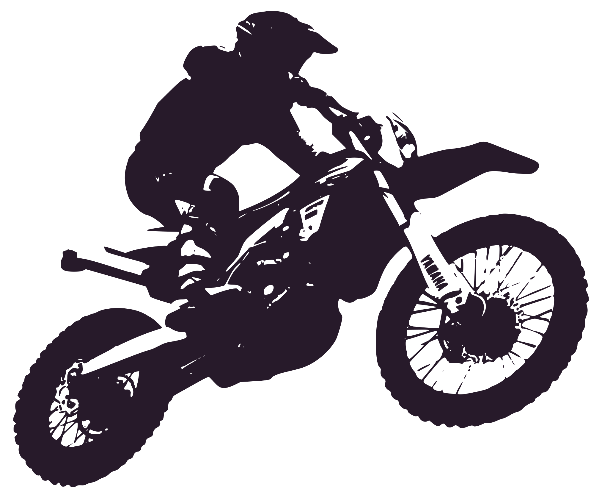 This features a silhouette of a person riding a motorcycle. They are wearing a helmet and have their arms outstretched, giving the impression that they are flying through the air. The motorcycle is positioned in the center of the scene with its front wheel raised off the ground, indicating that it's in motion. The silhouette of the rider is black, contrasting against a white background, which adds to the dramatic effect of the image.