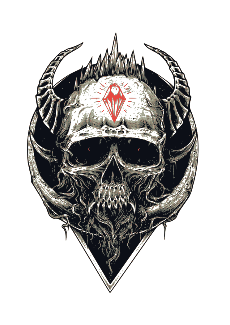 This features a skull with horns and a red diamond in the center of its head. This unique design gives it an evil or demonic appearance, making it stand out as a striking piece of artwork. The skull is adorned with two horns on top, adding to its distinctive look. The combination of the red diamond and the horns creates a visually captivating image that draws attention and sparks curiosity about the artist's intentions behind this design.