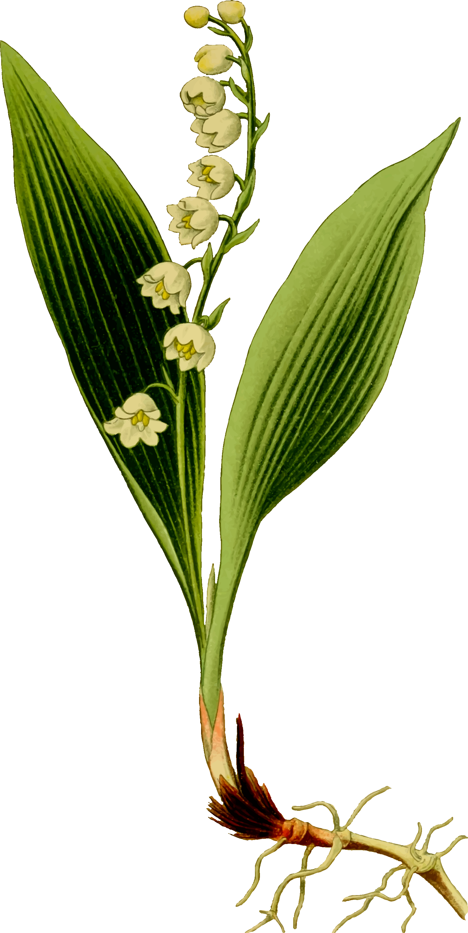 This features a close-up of a lily plant with two leaves and a stem filled with lots of flowers. The plant is adorned with white flowers, creating an elegant and beautiful scene. The roots are visible at the bottom of the plant, adding to its natural appearance. This detailed view showcases the intricate structure of the lily plant, highlighting its beauty and delicacy.