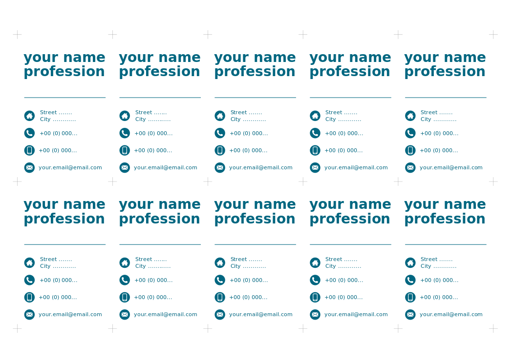 This features a set of six business cards, each with the same text on them. The text reads "Your Name Profession" and is displayed in blue letters. Each card has a different phone number listed below the main text, indicating that they are meant to be used for professional purposes. The cards are arranged in a neat row, showcasing their uniform appearance and design.