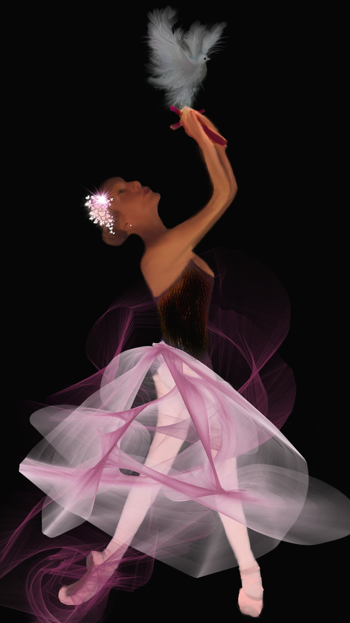 This features a beautiful young woman dressed in a pink tutu, standing on one leg and holding a white dove. She appears to be a ballerina, as she is wearing a black top and has her hair styled in an elegant manner. The scene takes place against a dark background, which adds depth and contrast to the image. The woman's focus on the dove suggests that it might hold some significance or symbolism for her performance. Overall, this captivating image showcases the grace and elegance of a ballerina in motion.