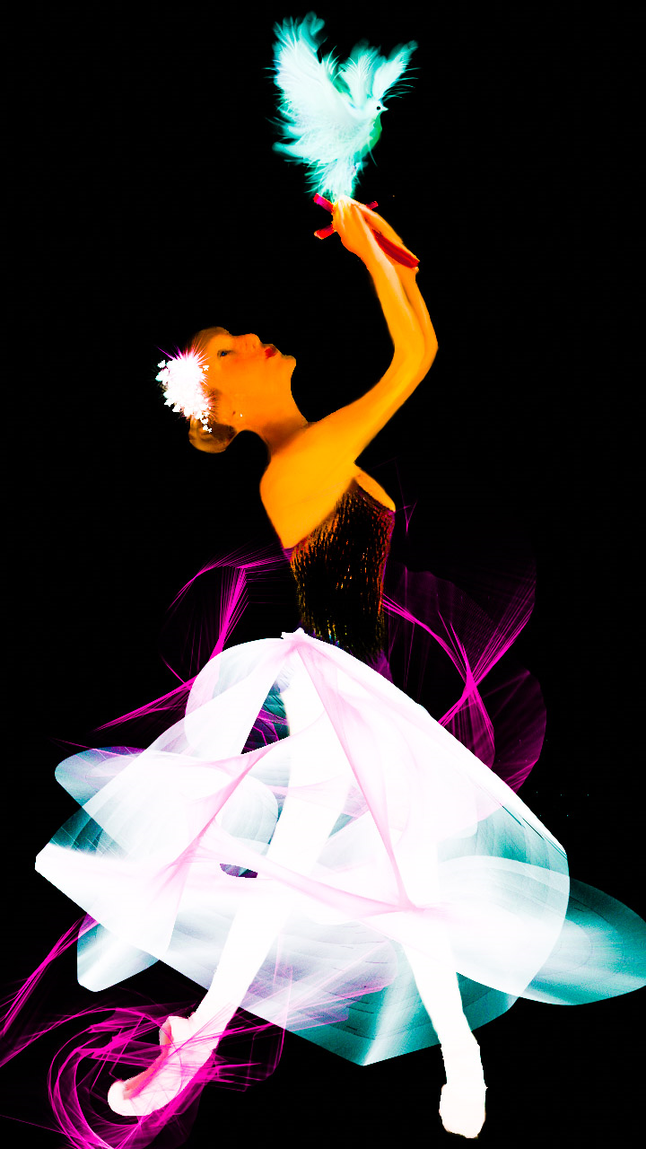 This features a woman dressed in a pink and white outfit, performing a ballet dance. She is holding a dove in her hand while executing the dance move. The scene appears to be black and white, giving it an artistic and timeless quality. The woman's attire suggests that she might be a ballerina or a performer of some kind, as she gracefully moves through the air during her performance.