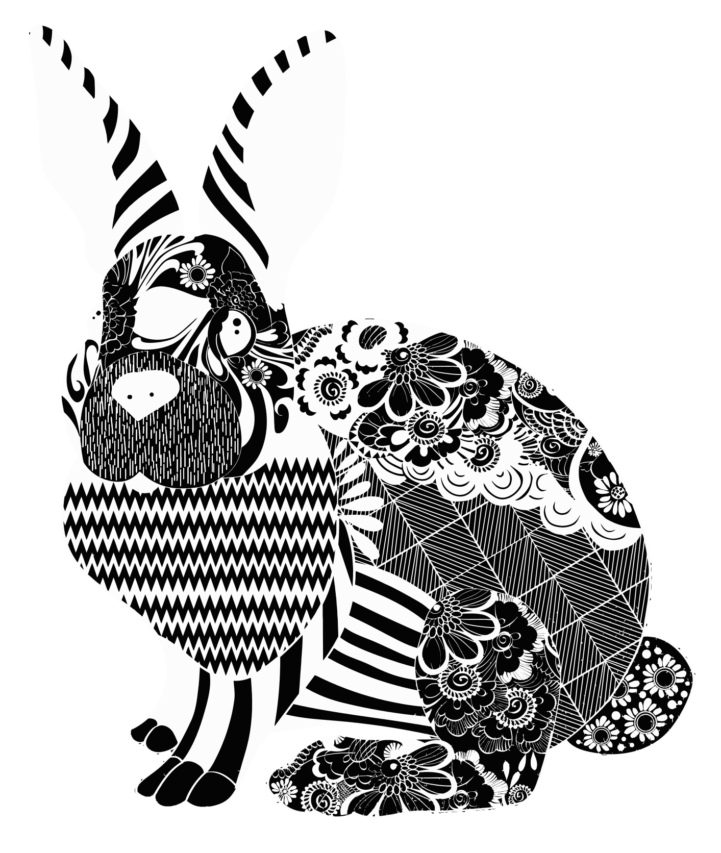 This features a black and white rabbit with a colorful design on its body. It is sitting in the center of the picture, surrounded by various patterns that make up its unique appearance. The rabbit's design includes a mix of flowers and other intricate details, creating an eye-catching visual effect. This artistic representation of a bunny adds a touch of creativity to the scene.