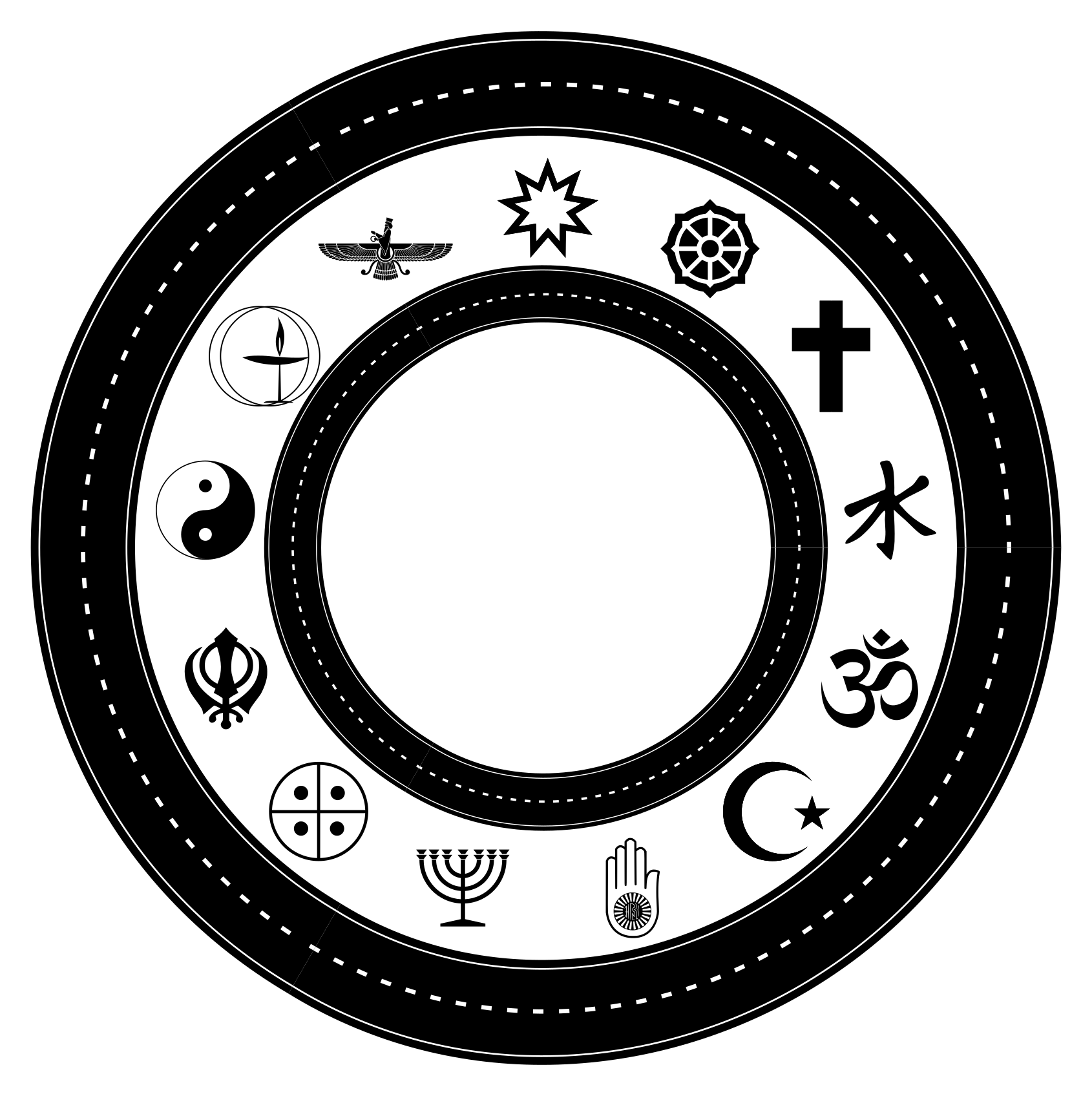 This features a black circle with various religious symbols and icons arranged around it. There are thirteen different symbols in total, each representing a unique aspect of faith or belief system. These symbols include crosses, stars, yin-yang signs, and other religious emblems. The arrangement of these symbols creates an intricate pattern that showcases the diversity and complexity of religious symbolism.