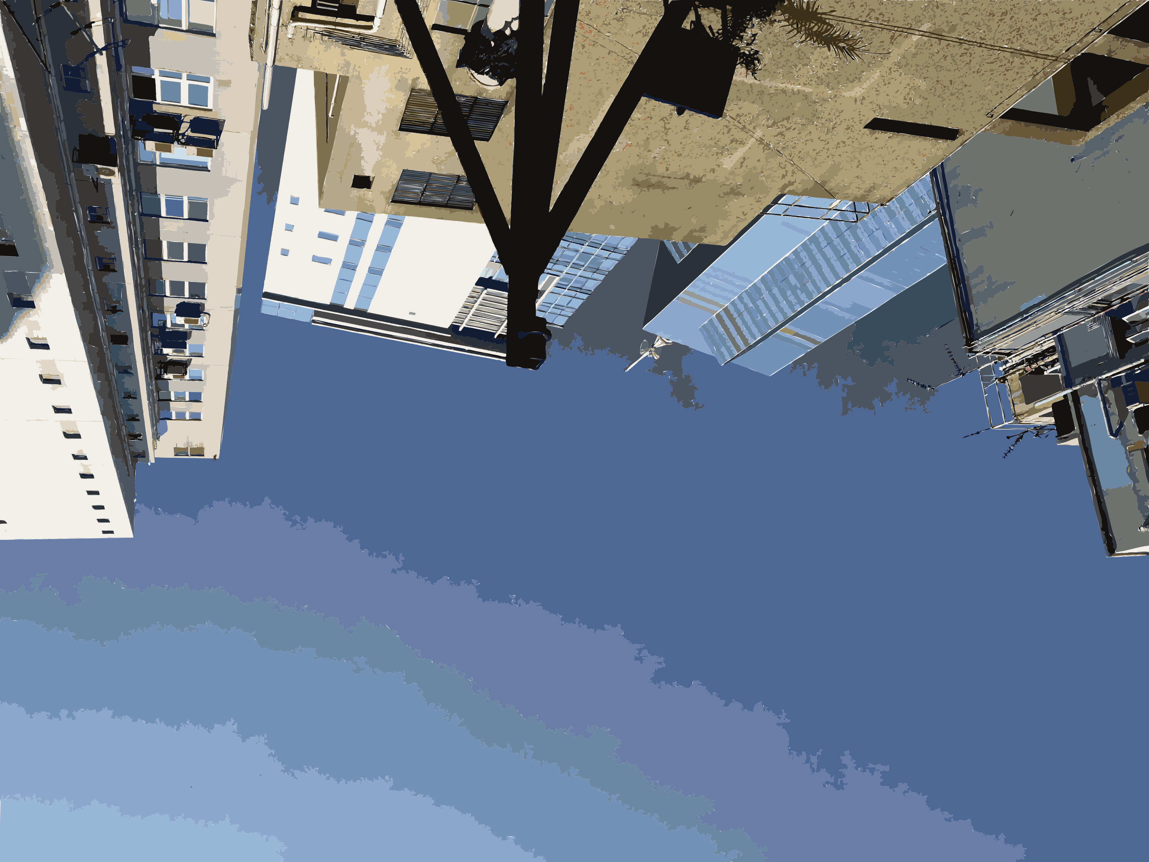 This features a cityscape with tall buildings and a blue sky. In the foreground, there is an upside-down view of a building, giving it a unique perspective. The scene also includes several cars parked in front of the buildings, adding to the urban atmosphere. Additionally, there are multiple traffic lights visible throughout the image, indicating that this is likely a busy city street with heavy vehicle and pedestrian traffic.
