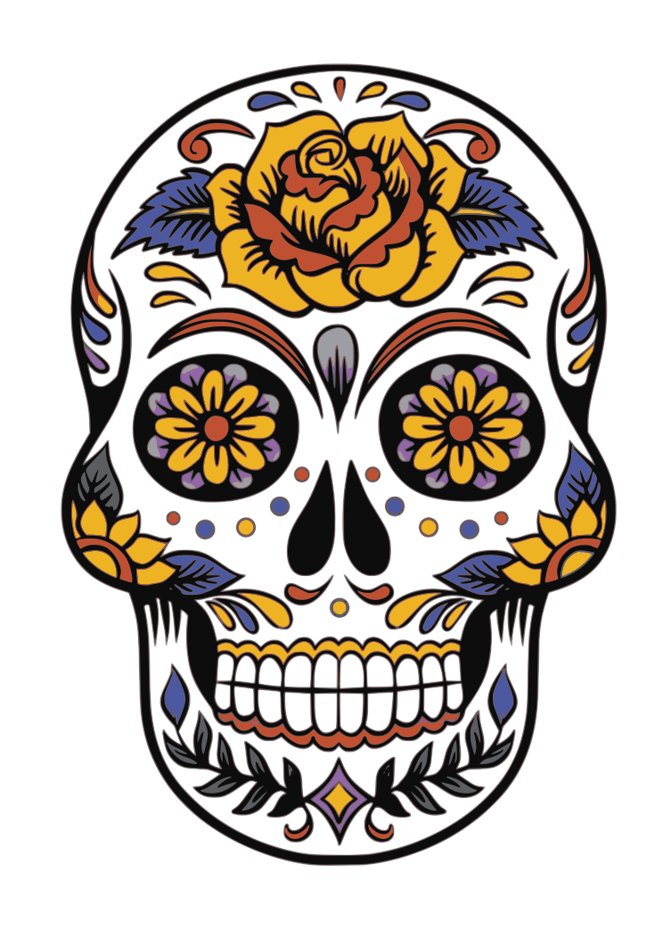 This features a colorful and intricately designed skull with yellow flowers adorning its eyes, head, and cheeks. The skull is the central focus of the design, surrounded by various floral patterns that add to the vibrant and lively appearance of the piece. The combination of the skull and the flowers creates a unique and eye-catching image that showcases both artistic skill and creativity.