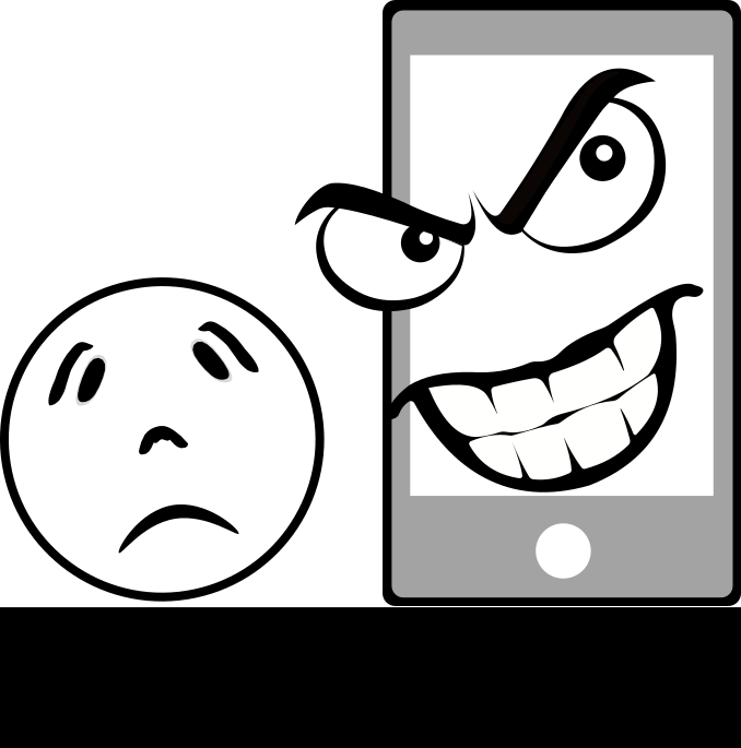 This features a cell phone with an angry face drawn on it, giving the impression of being upset or aggressive. Next to this angry cell phone is a sad face emoji, which contrasts with the angry expression of the cell phone. The scene appears to be set in a dark room, possibly at night.