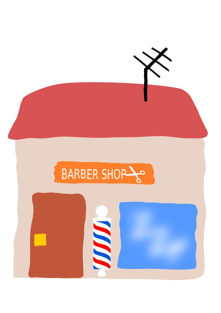 This features a small barbershop with a red roof and a sign that reads "Barber Shop." A person is standing in front of the shop, possibly waiting to be served. Inside the barbershop, there are two chairs visible, one on the left side and another on the right side. The overall scene gives off a vintage feel with its simple design and color scheme.