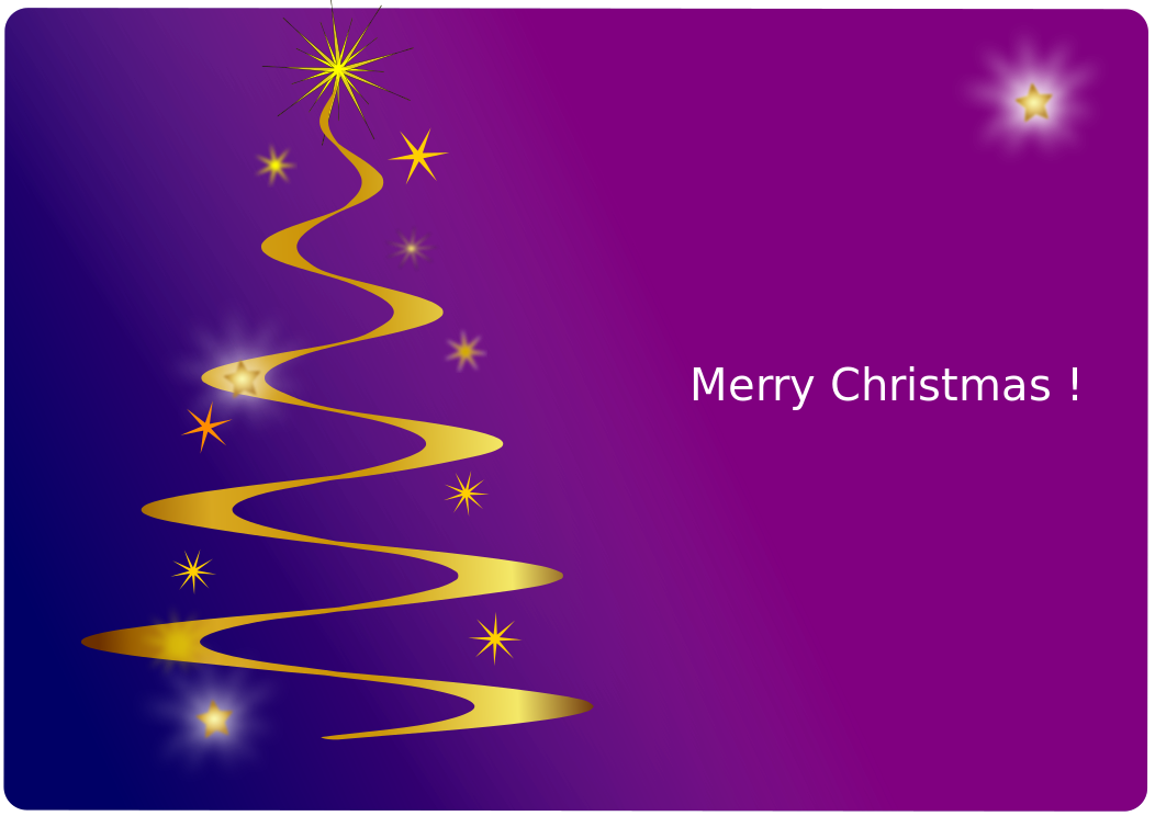 This features a purple background with a Christmas tree made up of gold and yellow helixes. The tree is adorned with stars, giving it a festive appearance. Above the tree, there are three stars that add to the holiday theme. The words "Merry Christmas!" are written in white letters on the purple background, emphasizing the cheerful atmosphere of the scene.