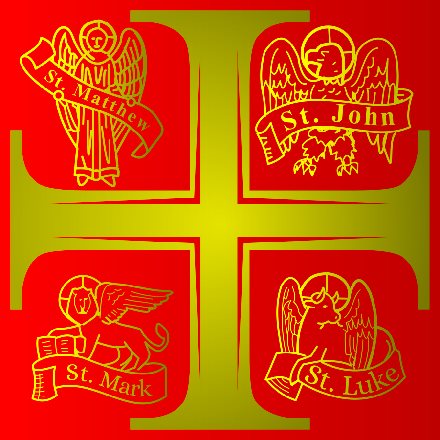 This features a red background with four different symbols representing the four evangelists. These symbols are St. Matthew, St. Mark, St. Luke, and St. John. Each symbol is placed in a square on the red background, creating an organized and visually appealing display. The colors of each symbol are distinct, making it easy to identify each one individually. This artistic representation of the four evangelists serves as a reminder of their importance in Christianity and their role in spreading the gospel.