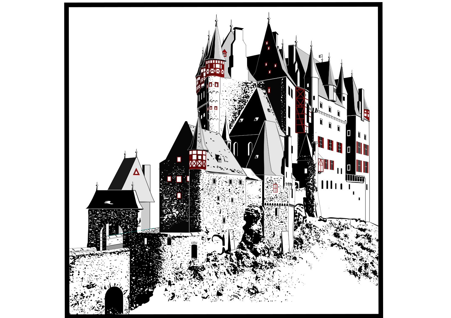 Tags: castle, medieval, black and white, drawing, castle eltz
