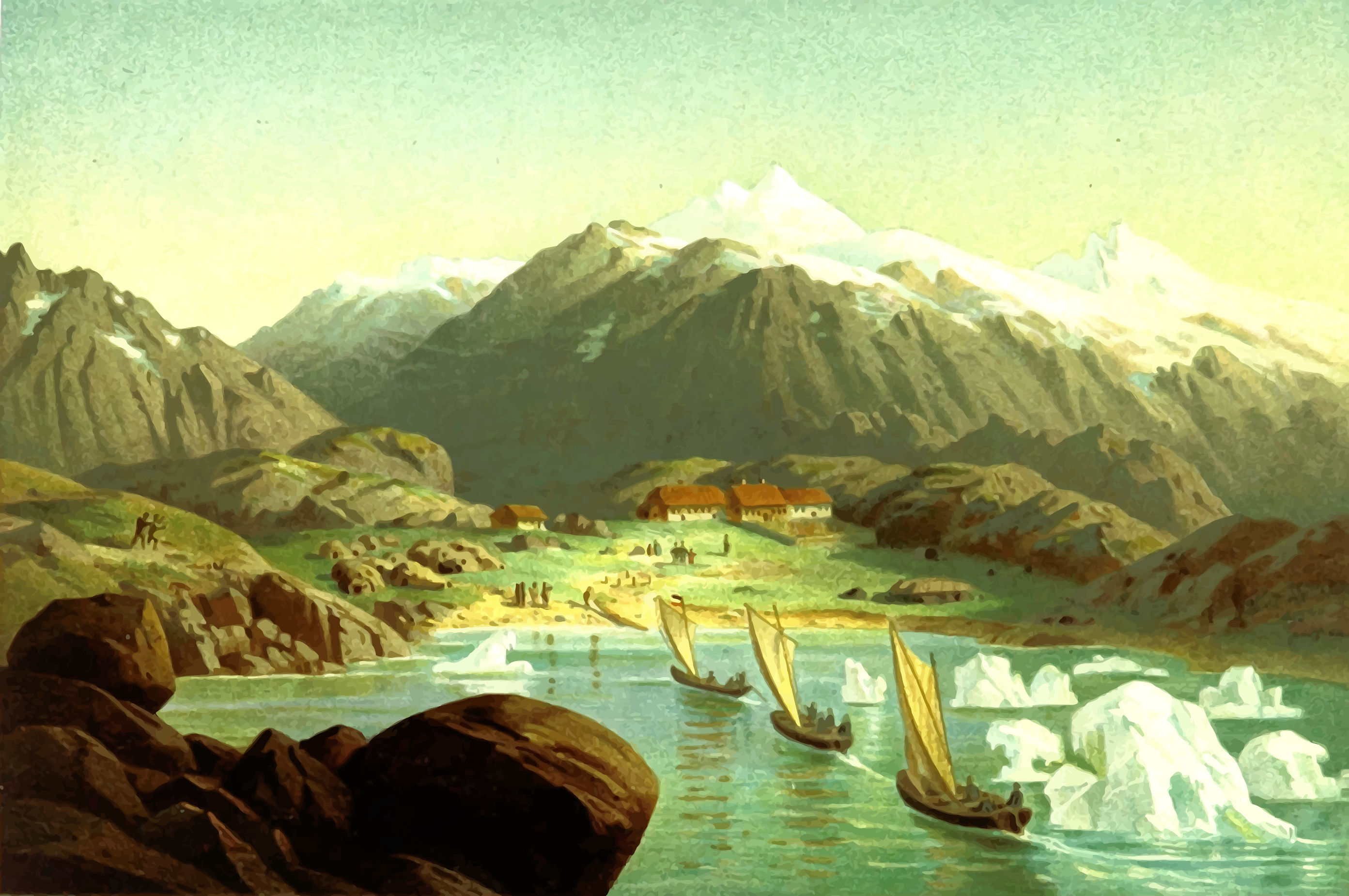 Tags: landscape, mountain, river, boat, person, scene arctic