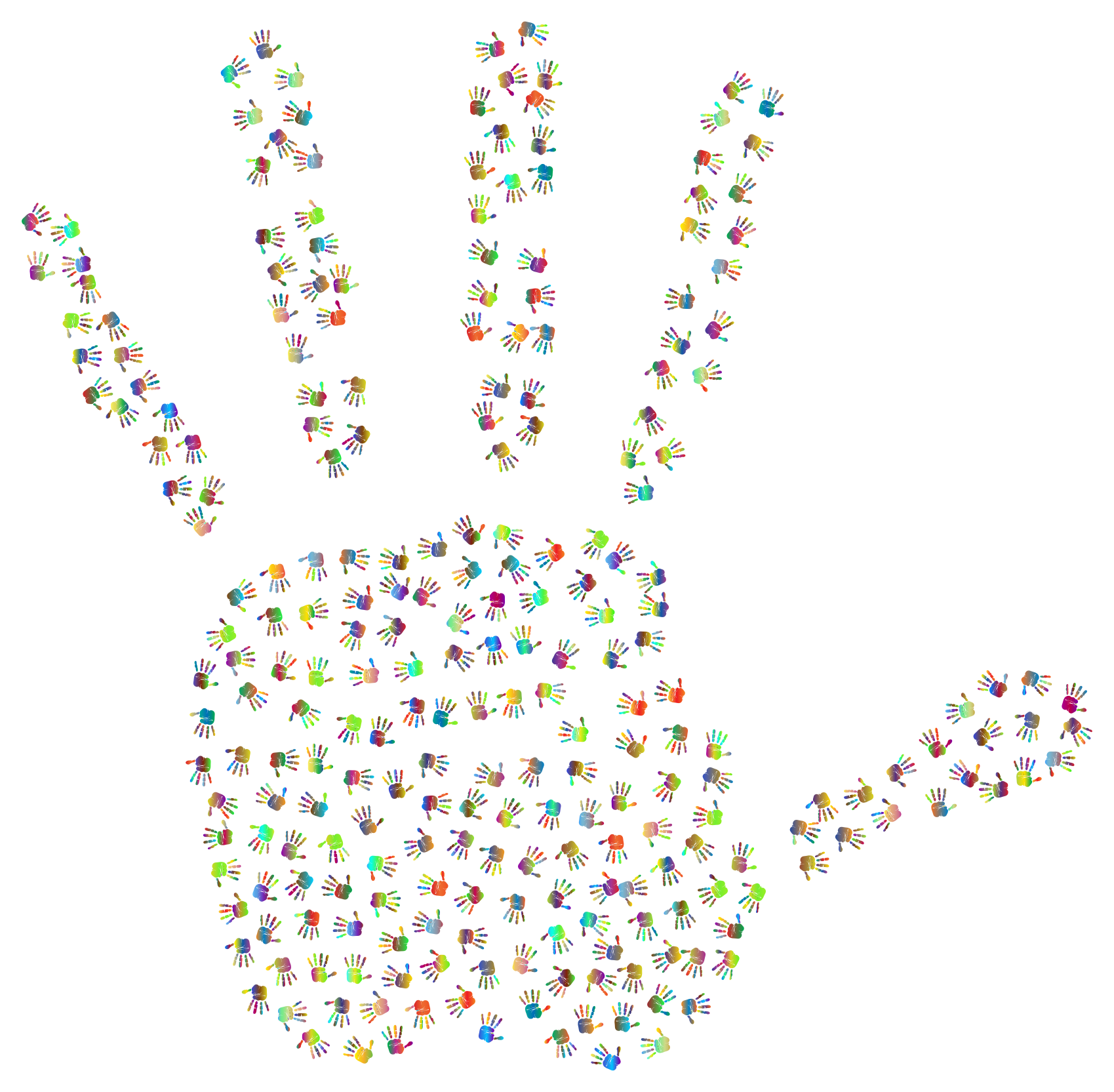 This features a large hand made up of many small hands, all connected with arrows. These smaller hands are colorful and diverse in size, creating an interesting visual effect. They are arranged to form the shape of a hand, showcasing creativity and artistic expression. The various colors and sizes of the smaller hands create a vibrant and dynamic scene that captures attention and adds a unique touch to the overall composition.