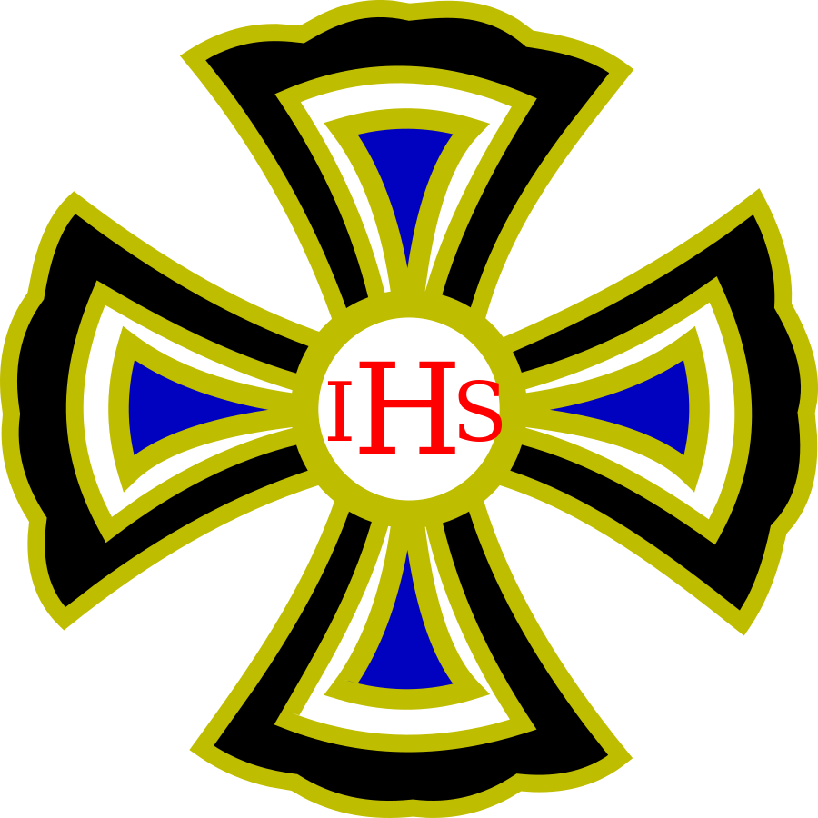 This features a large, ornate cross with the letters IHS in red. The cross is surrounded by blue and yellow colors, giving it an eye-catching appearance. The design of the cross includes multiple points or angles, making it visually interesting and unique. This symbolic representation of faith could be used as a decorative element or to convey religious significance.