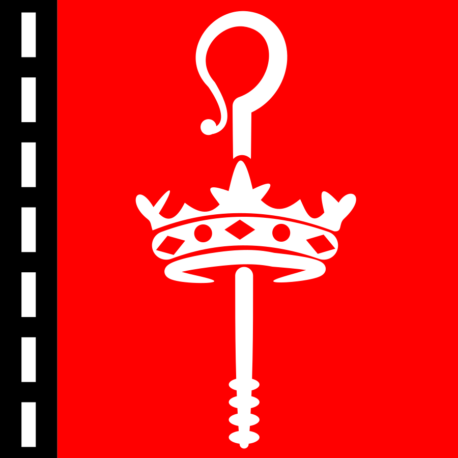 This features a red and white design with a crown on top. The crown is adorned with a key, giving it an elegant appearance. The color scheme of the design consists of red for the background and white for the crown and key. This unique combination creates a visually striking piece that stands out against its surroundings.