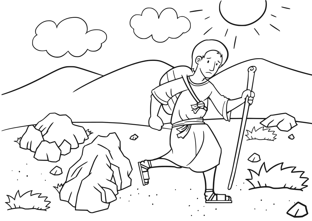 This depicts a man in biblical clothing, carrying a walking stick and wearing sandals. He is standing on a rocky terrain with mountains in the background. The scene appears to be from Genesis, as suggested by the attire of the man. The man's posture suggests that he might be traveling or exploring the area. The presence of rocks and mountains adds to the rugged landscape, creating an atmosphere reminiscent of a biblical story.
