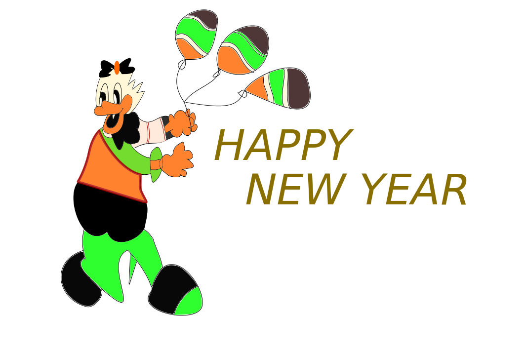 This features a cartoon character, possibly a dog or a cat, holding balloons in its hands. The character is wearing green and orange clothing, giving it a festive appearance. The balloons are of various colors, including red, white, and blue, adding to the cheerful atmosphere. The character appears to be celebrating New Year's Day with these colorful decorations.