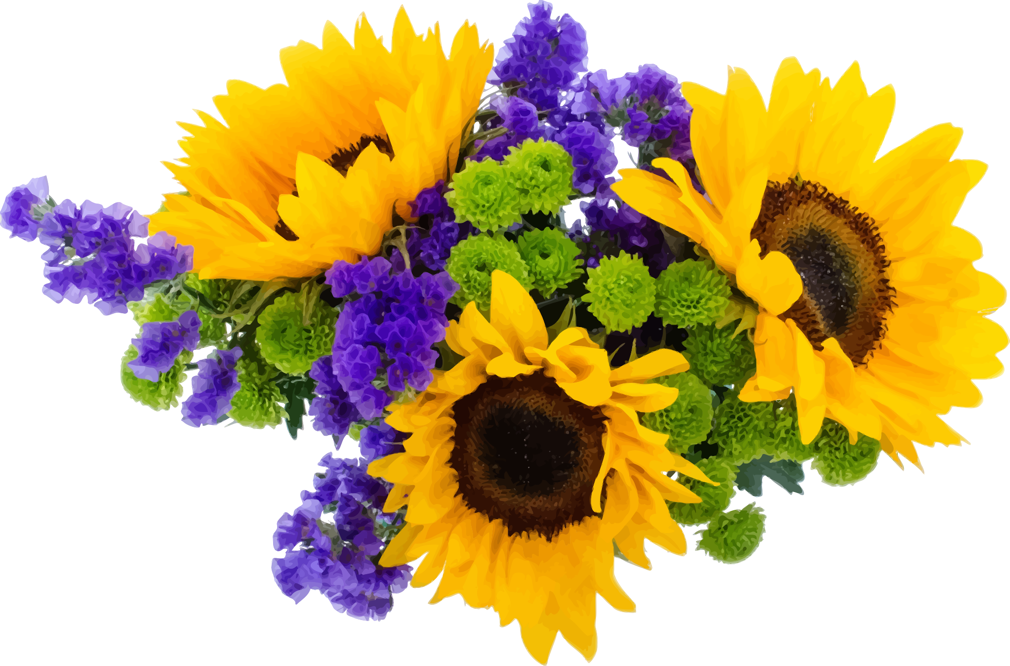This features a bouquet of sunflowers in various shades of yellow and purple. There are at least nine sunflowers visible, with some being larger than others. They are arranged together to create an eye-catching display. The sunflowers are placed on top of each other, creating a sense of depth and dimension within the bouquet. This arrangement is likely meant to be displayed in a vase or as a centerpiece for a special occasion or event.