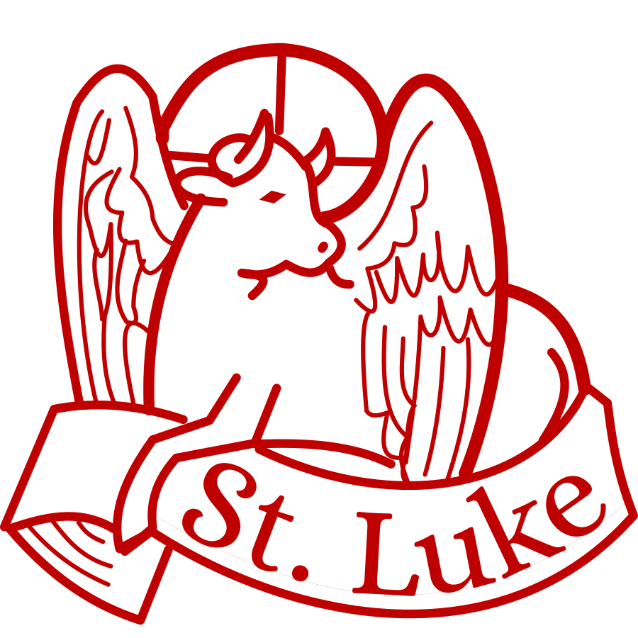 This features a red and white logo for St. Luke, which includes an ox with wings as its central figure. The ox is depicted in various positions, including sitting down and standing up, giving the impression of movement. The wings are spread out on both sides of the ox, adding to the dynamic nature of the design. The overall appearance of the logo suggests a strong connection between St. Luke and the image of an ox with wings.
