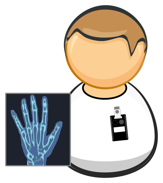 This features a cartoon-like representation of a person with an x-ray showing bones in their hand. This character is wearing a white shirt and has a badge attached to it, indicating that they might be a medical professional or worker. The x-ray itself is placed next to the character, providing a clear visual of the bone structure within the hand. Overall, this image portrays a person with an interest in medical imaging or healthcare professions.