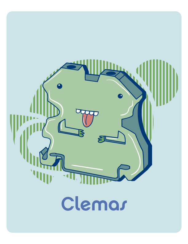 This features a green cartoon character with a big mouth, sitting on top of an object that resembles a piece of cake. This character is likely the mascot for a company or brand called Clemas. The character's facial expression and body language suggest it might be playful or humorous in nature. The overall design of the image appears to be colorful, with various shades of green and blue used throughout the scene.