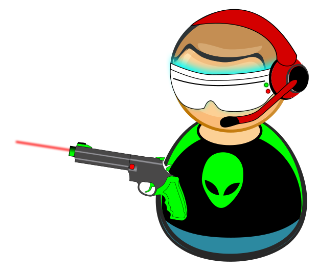 This features a cartoon character dressed in a futuristic outfit, holding a game gun and wearing VR goggles. The character is also wearing a shirt with an alien head design on it, giving the impression of being a space-themed character. The overall appearance of the character suggests that they are likely involved in some sort of virtual reality or video game experience.